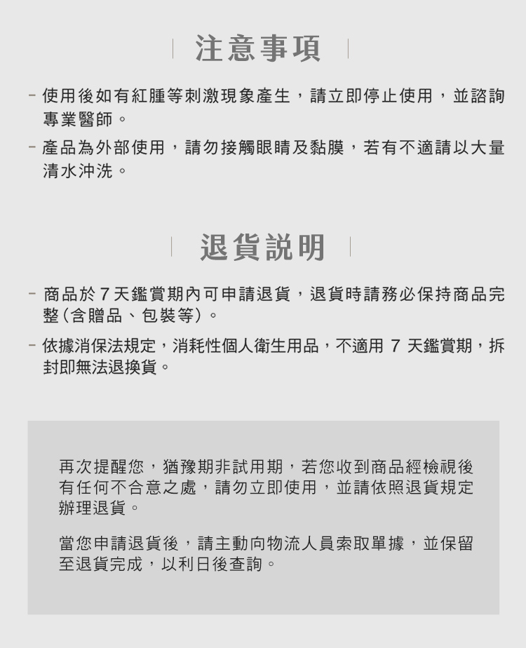 | 注意事項 ▎使用後若有過敏請即刻停止使用 |